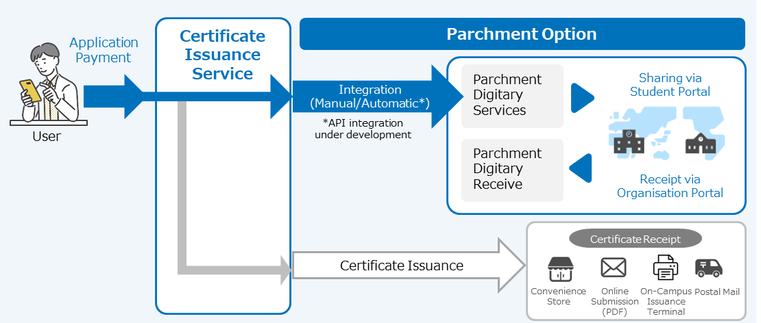As a result, customers can now choose between the online submission feature of the Certificate Issuance Service (“Online Submission Feature”), which enables the digital academic credentials to be sent to designated recipients mainly in Japan, and Parchment, which primarily facilitates submissions to overseas institutions. This dual-optional approach, which enables customers to choose the delivery method based on their destination, represents an innovative industry effort.