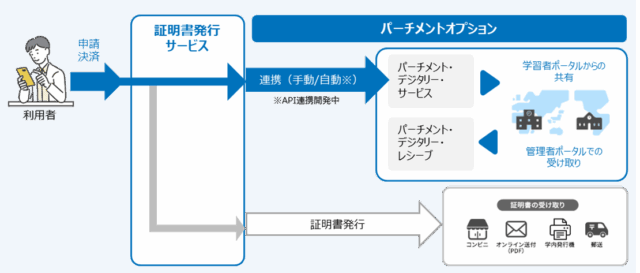 これにより、国内を中心にデジタル学修歴証明書を指定の宛先に提出可能な「証明書発行サービス オンライン送付機能(以下、オンライン送付機能)」と、主に海外への送付を対象とする「パーチメント」を、送付先により選択して証明書を送付できることとなり、これは業界では画期的な取り組みとなります。